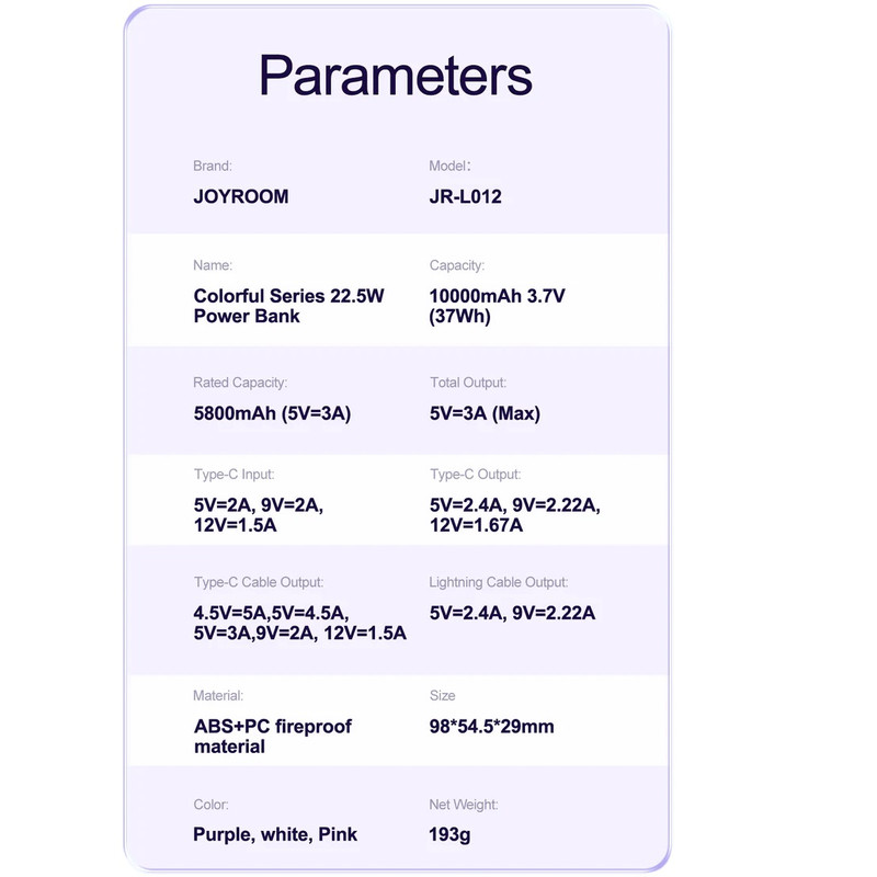 پاوربانک این روزها از ضروری ترین وسایل همراه ما به حساب می آیند. پاوربانک Joyroom JR-L012 با داشتن 2 کابل متصل، 1 پورت خروجی، حداکثر توان خروجی 22.5 وات و ظرفیت اسمی 10000 میلی آمپر ساعت می تواند همراه خوبی برای شما باشد. داشتن صفحه نمایش دیجیتال برای نمایش میزان باتری کامل کننده ویژگی های این پاوربانک است. مشخصات پاوربانک Joyroom JR-L012 پاوربانک Joyroom JR-L012 دارای ظرفیت اسمی به اندازه 10000 میلی آمپرساعت است. البته حتما در نظر داشته باشید ظرفیت اسمی با توجه به ولتاژ شارژ گوشی شما تغییر می کند. شما علاوه بر تلفن همراه، اسمارت واچ، تبلت و هندزفری بلوتوثی خود را نیز می توانید با آن شارژ کنید. پاوربانک جویروم JR-L012 از ABS و PC نسوز ساخته شده تا در برابر گرم شدن مقاوم باشد. ابعاد پاوربانک برابر 98x54.5x29 میلیمتر و وزنی برابر193 گرم دارد. برای اطلاع از میزان شارژ پاوربانک Joyroom JR-L012 نمایشگر دیجیتال در نظر گرفته شده است که میزان شارژ باقی مانده را نمایش می دهد. ایمنی پاوربانک Joyroom JR-L012 دارای تراشه ایمنی است تا از دستگاه های شما در برابر شارژ بیش از حد، داغ شدن، ولتاژ و جریان بیش از حد و اتصال کوتاه محافظت کند. پاوربانک جویروم JR-L012 با Android و iOS سازگار است. ظرفیت واقعی پاور بانک باید توجه داشته باشید که ظرفیتی که از پاوربانک دریافت میکنید دقیقا همان ظرفیتی که روی آن درج شده نخواهد بود. ظرفیت نوشته شده روی پاوربانک ظرفیت اسمی نام دارد. ظرفیت اسمی پاوربانکها با ولتاژ 3.7 ولت محاسبه میشود اما ظرفیتی که شما دریافت میکنید با ولتاژ مناسب دستگاهی است که آن را با پاوربانک شارژ میکنید. عواملی چون هدر رفت ظرفیت طی فرآیند تبدیل ولتاژ، استفاده از کابل نامناسب، استفاده از گوشی در حین شارژ توسط پاوربانک، باز بودن برنامههای زیاد در پس زمینه گوشی و ... میتوانند در از دست رفتن ظرفیت پاوربانک تاثیر گذار باشند. ظرفیت واقعی این پاوربانک 10000 میلی آمپر بسته به ولتاژ خروجی دستگاههای شما حدودا در رنج 4 تا 7 هزار میلی آمپر خواهد بود.