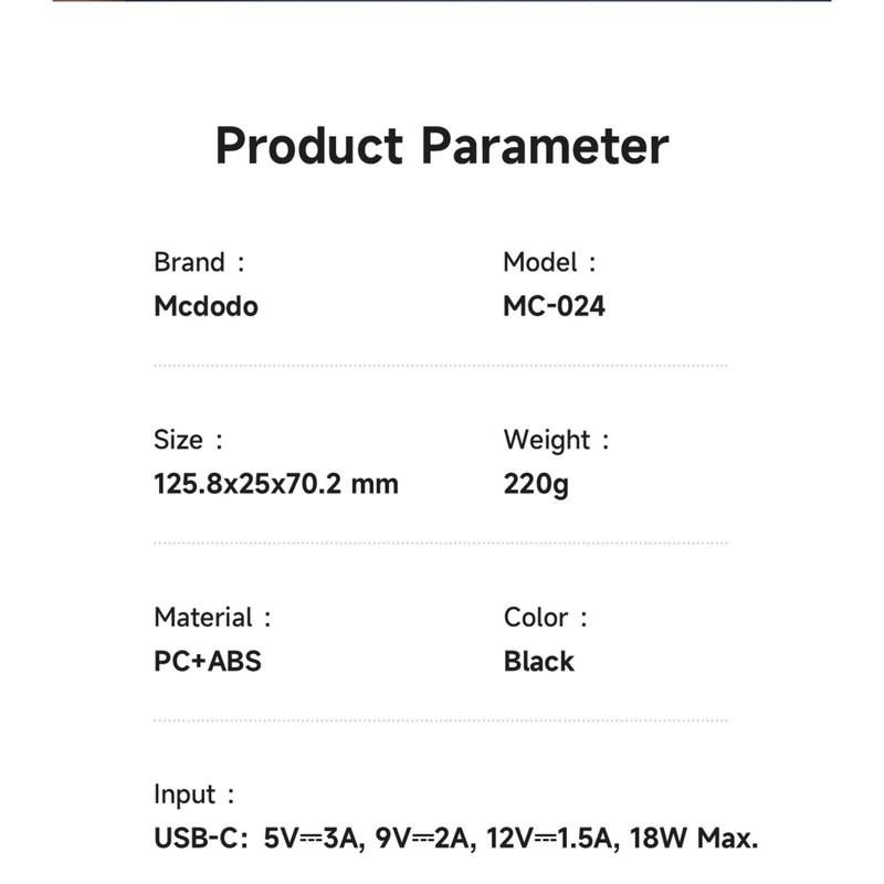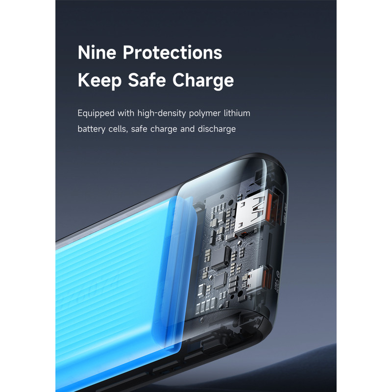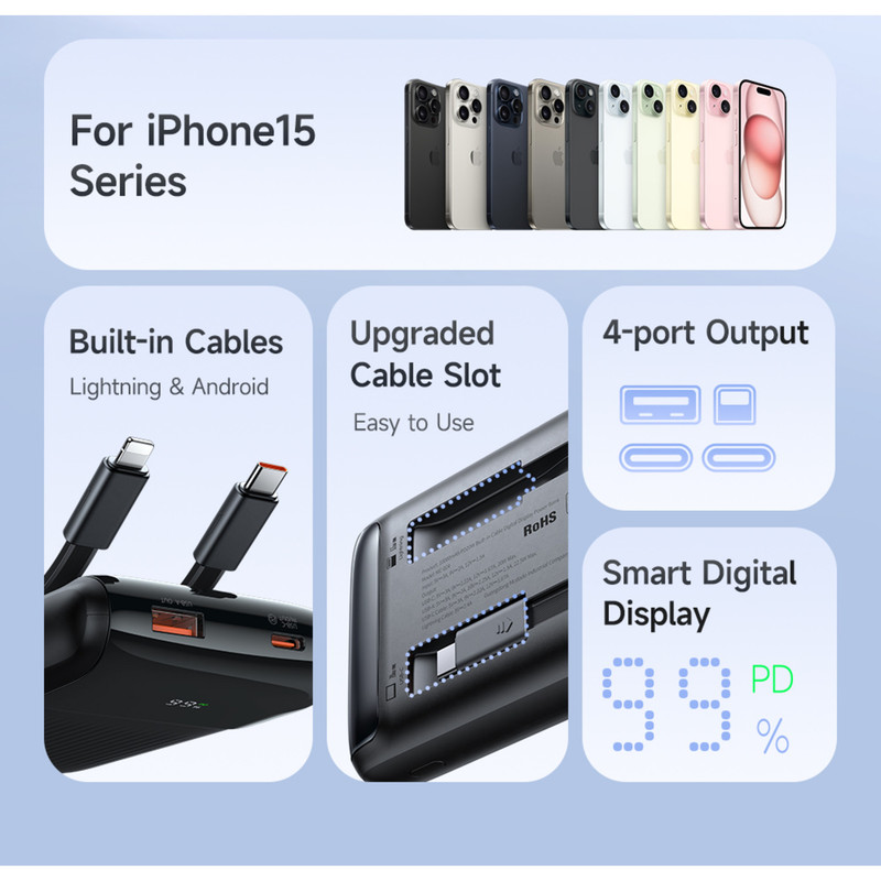 ظرفیت باتری: 10000mAh (باتری لیتیوم پلیمر) ورودی: USB-C (5V=3A, 9V=2A, 12V=1.5A) خروجیها: USB-A: 22.5 وات (5V=3A, 9V=2A, 10V=2.25A, 12V=1.5A) USB-C: 20 وات (5V=3A, 9V=2.22A, 12V=1.67A) کابل USB-C: 20 وات کابل Lightning: 5V=2.4A