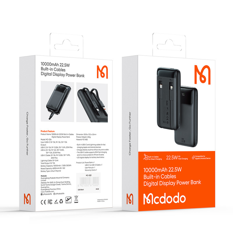 پاوربانک مک دودو مدل MC-024 یک انتخاب بینظیر برای افرادی است که به دنبال یک دستگاه قابلحمل، قدرتمند، و چندکاره هستند. این پاوربانک با ظرفیت 10000 میلیآمپر ساعت و طراحی جمعوجور، به شما اجازه میدهد تا همیشه و همهجا دستگاههای الکترونیکی خود را با خیالی آسوده شارژ کنید. تجربهای بینظیر از شارژ سریع: یکی از مهمترین ویژگیهای این پاوربانک، توان شارژ سریع 22.5 وات آن است که باعث میشود دستگاههای شما با سرعتی باورنکردنی شارژ شوند. در عرض تنها 30 دقیقه میتوانید گوشی آیفون یا هر دستگاه اندرویدی را تا 60 درصد شارژ کنید. این پاوربانک از پروتکلهای شارژ سریع PD (Power Delivery) و QC (Quick Charge) پشتیبانی میکند، به این معنا که با جدیدترین دستگاهها نیز کاملاً سازگار است. چه در حال سفر باشید، چه در یک جلسه کاری مهم، دیگر نگرانی بابت تمام شدن شارژ نخواهید داشت! دو کابل داخلی، همه نیازهای شما را رفع میکند: یکی از نقاط قوت این پاوربانک، وجود دو کابل داخلی USB-C و Lightning است. این ویژگی منحصربهفرد باعث میشود که همیشه کابل مورد نیاز برای شارژ دستگاههای اپل و اندروید را در دسترس داشته باشید، بدون نیاز به حمل کابلهای اضافی. این طراحی هوشمندانه، راحتی فوقالعادهای را به شما ارائه میدهد و به شما اجازه میدهد تا به سرعت دستگاههای مختلف خود را شارژ کنید. شارژ همزمان چند دستگاه: آیا نیاز دارید همزمان چند دستگاه را شارژ کنید؟ پاوربانک MC-024 با داشتن 4 خروجی، امکان شارژ همزمان چهار دستگاه را فراهم میکند. این دستگاه میتواند آیفون، تبلت، هدفون بیسیم، و ساعت هوشمند شما را همگی بهطور همزمان و سریع شارژ کند. به لطف این ویژگی، دیگر نیازی به منتظر ماندن برای شارژ هر دستگاه به صورت جداگانه نخواهید داشت. طراحی زیبا و بادوام: این پاوربانک نه تنها قدرتمند است، بلکه با طراحی ظریف و بدنهای از جنس ABS و PC مقاوم، بهعنوان یک محصول با دوام و شیک شناخته میشود. ابعاد کوچک و وزن سبک (تنها 220 گرم) آن را به گزینهای ایدهآل برای قرار گرفتن در کیف یا جیب شما تبدیل کرده است. همچنین، نمایشگر LED دیجیتال آن به شما امکان میدهد وضعیت باتری را به راحتی مشاهده کنید، تا همیشه از میزان شارژ باقیمانده آگاه باشید.